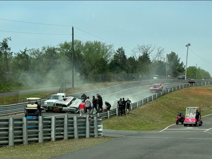 Instead of Texas, our first race was Easter Weekend at Sumerduck Motorsports Park with some great funny cars including my brother from another mother Rocky Pirrone, Gary Pritchett, Bobby Toth, Matt Stambaugh, and Wade King. The match race was set up “Chicago Style” meaning that the quickest 2 cars from the first round run for the “final”. Luckily, our first run was the second quickest setting us up to race Gary Pritchett in Bunny Burkett’s car. The bad news was that my pal Wade King had a parachute malfunction and while doing an amazing job trying to keep his car in one piece ended up wrecking his beautiful 55 Chevy. I was working to slow the Mustang down when Wade came by with no ‘chutes and I knew how it was going to play out. I got on the brakes HARD and managed to give him plenty of room. Thankfully, other than a few bruises, Wade walked away from the crash.
